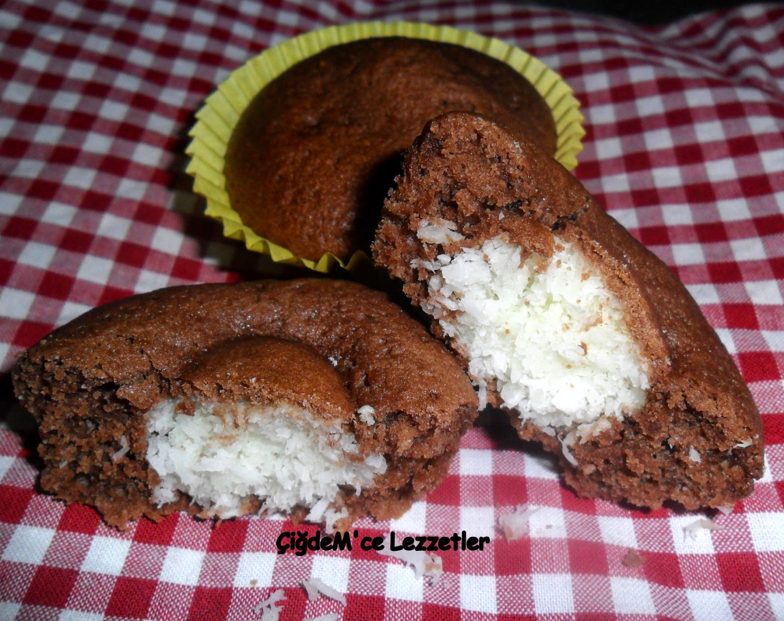 - Kek harcımızdan kek kalıplarını 2 yemek kaşığı kadar alalım. Ve hazırladığımız hindistan cevizi toplarından içine koyalım.