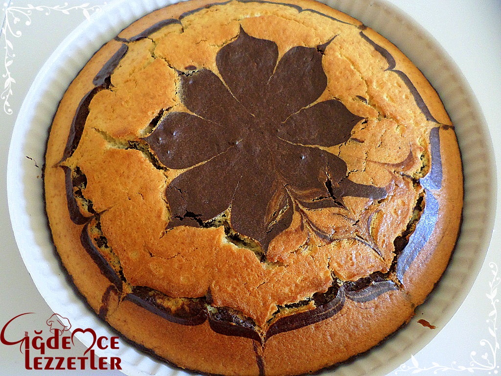 Buraya kadar ne yaptık tekrarlayayım hafif yağlanmış tepsiye kakaolu sade olacak şekilde ben çiçek resmi koyu renk olsun diye kakoluyu en üste denk getirecek şekilde ekledim. Bu işlemden sonra yapacağımız tek şey kürdan ile şekil vermek. Tepsinin tam ortasına bir kürdan batırın. Diğer bir kürdan yardımı ile yoksa bıçakla da yapabilirsiniz. Pizza dilimleri yapar gibi yukarıdan aşağıya doğru keserek 8 parça oluşturalım ve ardından bu üçgenlerin tam ortasından içten dışa doğru 8 parça çizelim. Burada resimler yardımcı olacaktır. Şeklimiz aynen kendisi oluşuyor dilerseniz farklı sanatlarda yapabilirsiniz. İlerleyen zamanlarda farklı sanatlar yapacağız takipte kalalım. Kekin yumuşaklığı tadı da çok güzel. Dilim fotoğrafını alamadım ama o da çok güzeldi. Mutlaka deneyin. Çayla servis edelim. Afiyet olsun 🙂