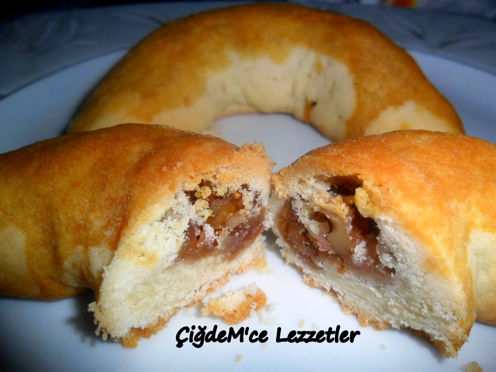Yoğurma kabımıza oda sıcaklığında yumuşamış margarini alalım. Ardından diğer malzemeleri de ekleyerek ele yapışmayan çokta sert olmayan bir hamur elde edelim. İçi için incirleri sıcak suda bekletelim. Ardından rendelenmiş elmaları, şekeri ve minik minik doğradığımız incirleri soteleyelim. Ocağımızı kapattıktan sonra tarçın ve cevizi ekleyelim.