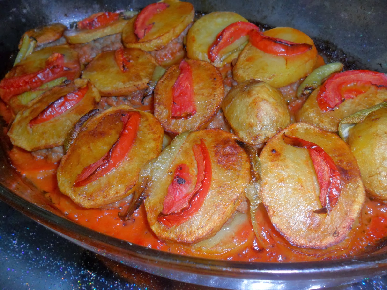 Patatesleri kalın kalın doğrayalım ve kızgın yağda pembeleşinceye kadar kızartalım. Bu arada köftemiz hazırlayalım. Kıymaya rendelediğimiz soğan ve sarımsağı ekleyelim. Yumurtayı ve baharatlarını ekleyip azar azar bayat ekmeği ekleyerek (yaklaşık 1 çay bardağı) köftemizi iyice yoğuralım. Köfteleri kızartmıyoruz fırında pişecek 🙂 Patates büyüklüğünde köftemize şekil verelim. Patateslerin üzerine köfteyi yerleştirelim. Köfte üzerine tekrar patates yerleştirelim.