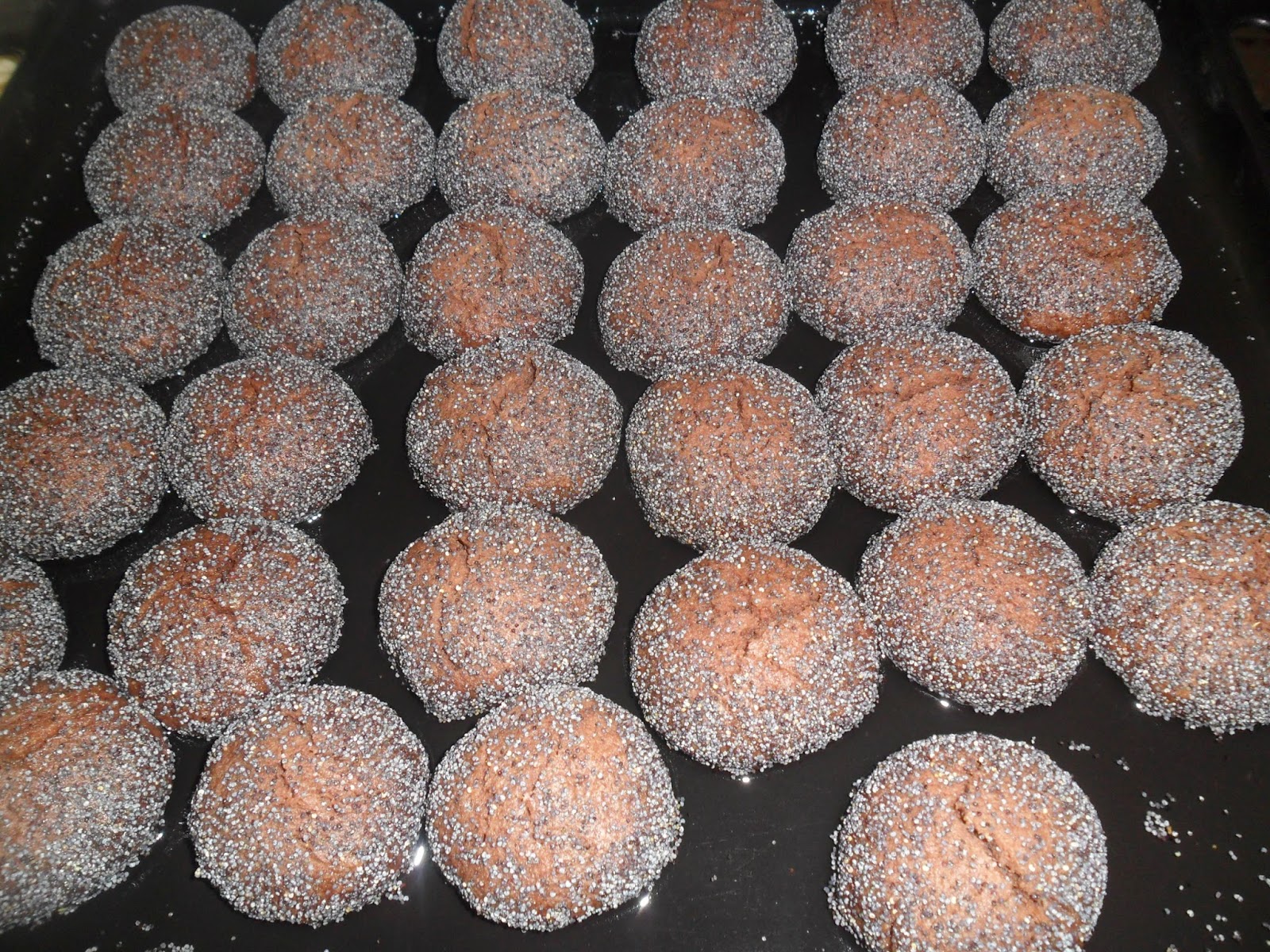- Oda sıcaklığında yumuşamış margarini yoğurma kabımıza alalım. Un hariç bütün malzemeleri ekleyerek elimizle iyice yoğuralım. Azar azar un ilave ederek ele yapışmayan ne çok yumuşak ne çok sert olmayan normal kıvamda bir hamur elde edelim. Yuvarlak şekil verelim ve mavi haşhaşa her tarafını batıralım. Tepsiyi yağlamadan kurabiyelerimizi yerleştirelim.