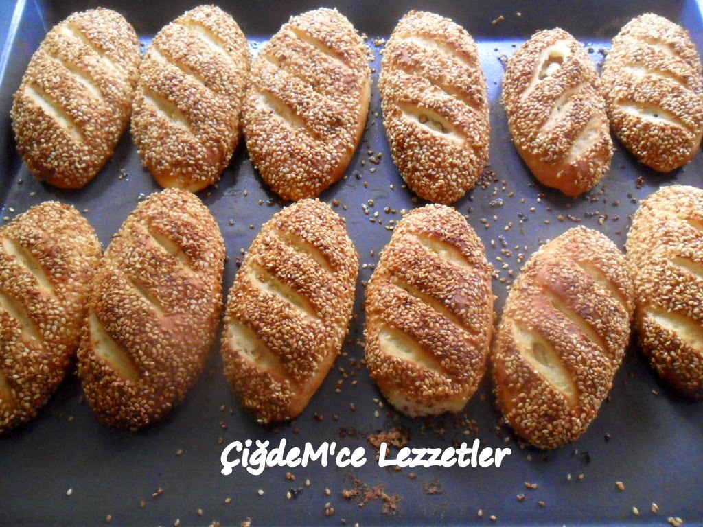Sütü ılıtalım yoğurma kabımıza alalım. Şeker ve mayayı alalım 5 dakika kadar bekletelim. Yumurta, sıvıyağ, eritilmiş tereyağı, tuz ve azar azar unu ilave ederek kulak memesi yumuşaklığında hamurumuzu yoğuralım. Hamuru 15 dakika kadar mayalanması için ılık bir ortamda bekletelim. Dinlenen hamurdan yumurtadan biraz daha küçük bezeler yapalım. Daire şeklinde açalım peynirli harcımızdan ekleyelim ve badem şeklinde şekil verelim. Önce pekmezli suya daha sonra tavada kavurduğumuz susama batıralım ve tepsimize alalım. bıçak ile üzerine çizik atalım. Resim yardımcı olacaktır.
